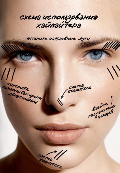 Схемы нанесения хайлайтера на лицо позволят вам быстро освоить эту технику. Внимательно рассмотрите их, поэкспериментируйте. Достаточно одного-двух раз и вы станете настоящим виртуозом в этом деле.