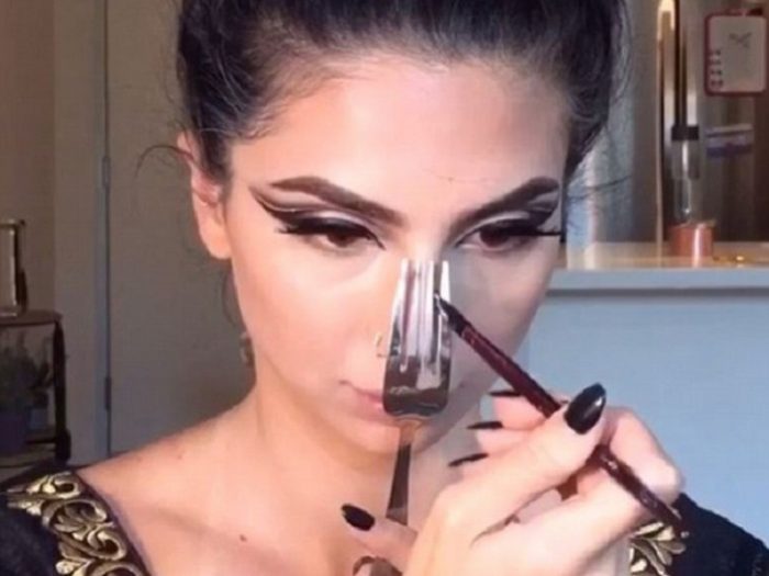Вам не показалось. Помощь в нанесении макияжа может оказать обычная кухонная вилка. Приложите ее к носу и проведите в боковых разрезах линии контурным тоном. Теперь уберите вилку и при помощи кисти тщательно растушуйте.