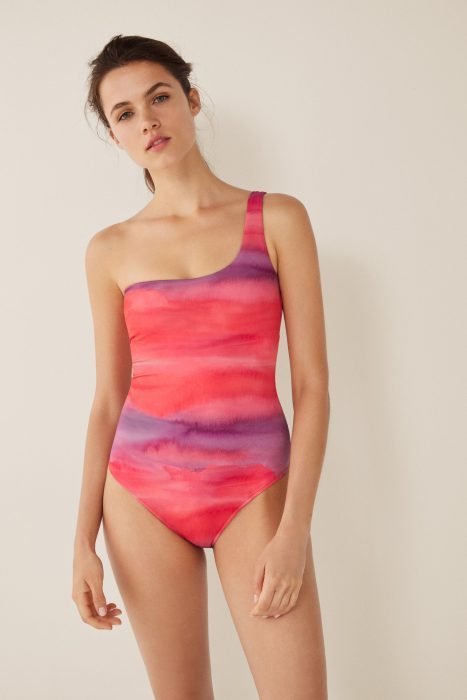 Асимметрия — хит этого лета. Тренд коснулся не только летних нарядов, но и пляжной моды. Раздельный или цельный купальник — не важно, главное — наличие лямки на одно плечо. Она может быть тонкой, широкой, в виде оборки — вариантов много.
