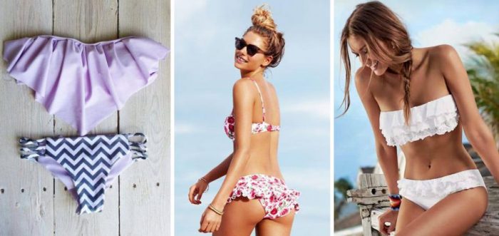 Такие купальники не только выглядят стильно, модно, женственно, но еще и помогают скорректировать фигуру. Струящиеся воланы добавляют объема. Это не всем нужно, но иногда визуальная коррекция, откровенно говоря, спасает ситуацию. Если барышня не может похвастаться большой грудью, то ей подойдет купальник с воланом на лифе. Если подкачали бедра и нужно добавить сюда объема, то стоит выбирать модель с оборками на бикини.