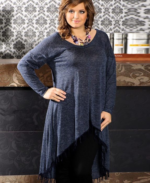 Выбирайте модели туники с ассиметричной баской. Они смотрятся оригинально и помогают спрятать все «неудобные» места. Также в моде спадающие на одно плечо туники и пончо.