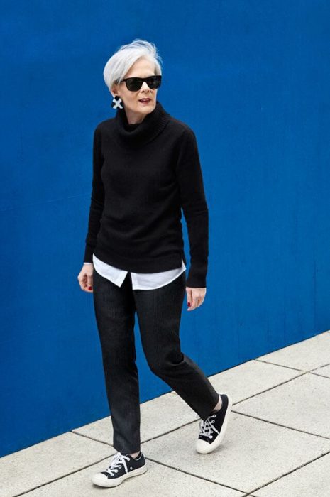Обзаведись парой кроссовок или кед. Сейчас такую обувь можно вписать в любой образ: их сочетают с платьями, брюками, пальто. Но за кроссовками не стоит идти в специализированный спортивный магазин: вам нужна городская модель, которая продается в обычном обувном. Дамам элегантного возраста стоит выбирать темные или белые модели без вставок: они подходят под все.
