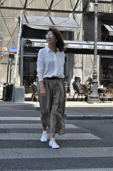 Плюс в том, что носить классические брючные комплекты в современных реалиях можно с любой обувью. Подойдут как лодочки, так и лоферы, кроссовки.