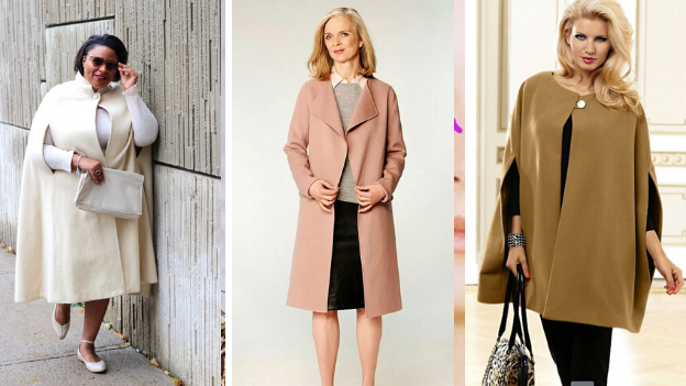 Также в моде кейпы — пальто-накидки без рукавов. Они подходят полным и худым дамам. Сочетаются с юбками-карандашами, брюками, джинсами.