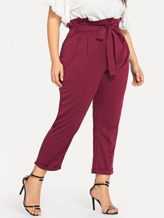 Paperbag могут быть сшиты в разном стиле: милитари, классика, палаццо. Это позволяет создавать строгие и непринужденные образы. Отлично смотрятся с жакетами, блузками, майками, укороченными топами. Обувь — по желанию.