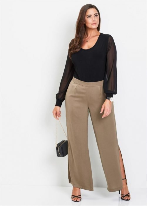 Брюки могут быть выполнены из любой ткани. Хлопковые и льняные палаццо более строгие, удерживающие форму. Шелковые и шифоновые брюки легко спутать с легкой юбкой.