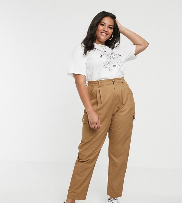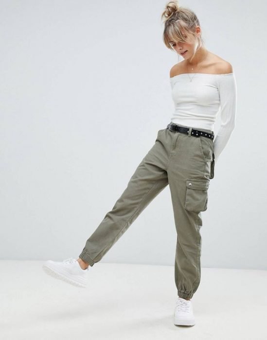 Карго хорошо смотрятся с блузками, топами, футболками. Обувь подойдет любая: от каблука до кроссовок.