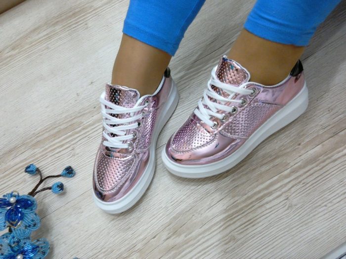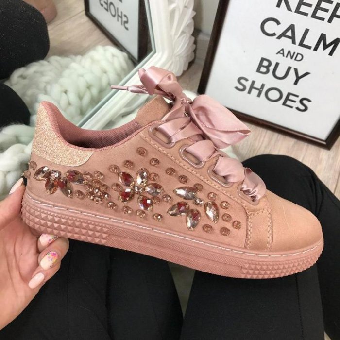 Недавний тренд сейчас выглядит как полная безвкусица. Актуальны гладкие модели без объемного декора. Если хочется блестеть и выглядеть нарядно, замените кроссовки со стразами на модели с металлическим блеском или золотистыми пайетками.