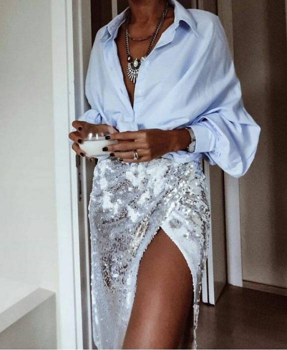 Вещи, расшитые пайетками, — однодневки. Только представьте, во что превратятся такие модели после первой же стирки. К тому же, пайетки притягивают и отражают свет. Вообразите, как нелепо будет выглядеть блестящая юбка под лучами солнца. Если не хотите казаться «сорокой», скажите строгое «нет» подобным вещам. Лучше и богаче смотрятся вещи из металлизированных тканей.
