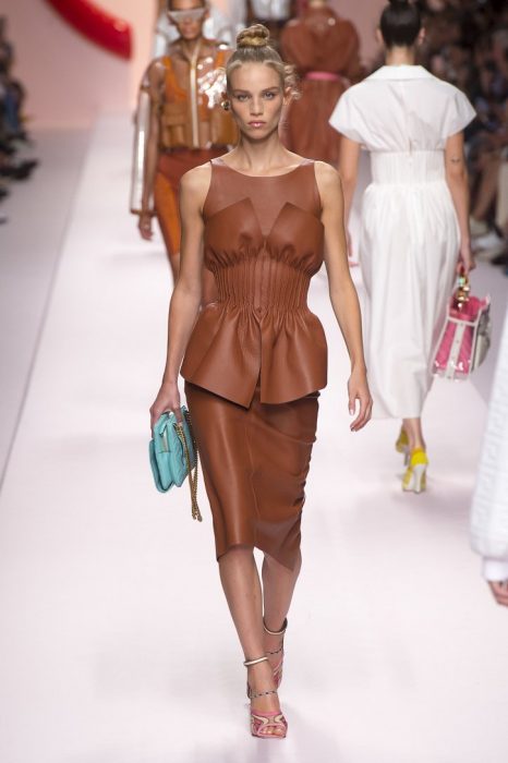 Выигрышно смотрятся монохромные кожаные комплекты. Цветовое решение образа может быть любым: строгий черный цвет или кричащий малиновый оттенок — решать вам. Обязательно прикупите себе комплект из бежевой кожи, как на показах Fendi: нейтральный оттенок выглядит благородно, наряд можно носить и в пир, и в мир.