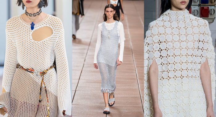 В этом сезоне вернется тренд 70-х — кроше. Такое название получила одна из техник вязания крючком. Для кроше характерна воздушная структура, сквозные дырки. Вспомните, как выглядят вязаные салфетки из бабушкиного сундука: вот это и есть кроше. Для повседневного образа выберите ажурный верх и сочетайте его с джинсами, для особых случаев — женственное платье-кроше в тандеме с льняным пиджаком.