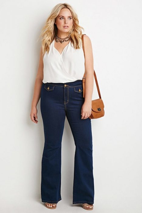 Лучше, чтобы клёш начинался от бедра. Плавно расширяющиеся штанины скроют полноту и не создадут форму песочных часов.