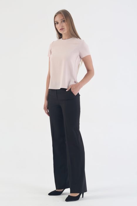 Расклешённый низ восстанавливает баланс. На фоне широких штанин бёдра кажутся не такими тяжёлыми. Однако клёш от колен производит обратный эффект. Сужающиеся к коленям брюки, выделяют низ и верх, создают контраст с узкой серединой.