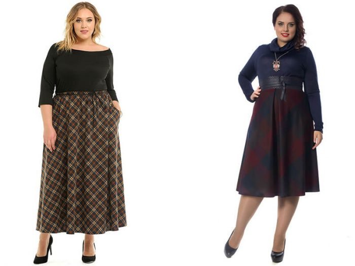 Идеальна для полного низа юбка А-силуэта и прямого фасона. Длина — от колен и ниже. Линия на уровне бёдер разрежет их пополам и подчеркнёт ширину.