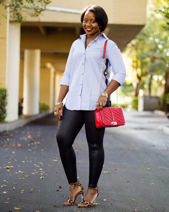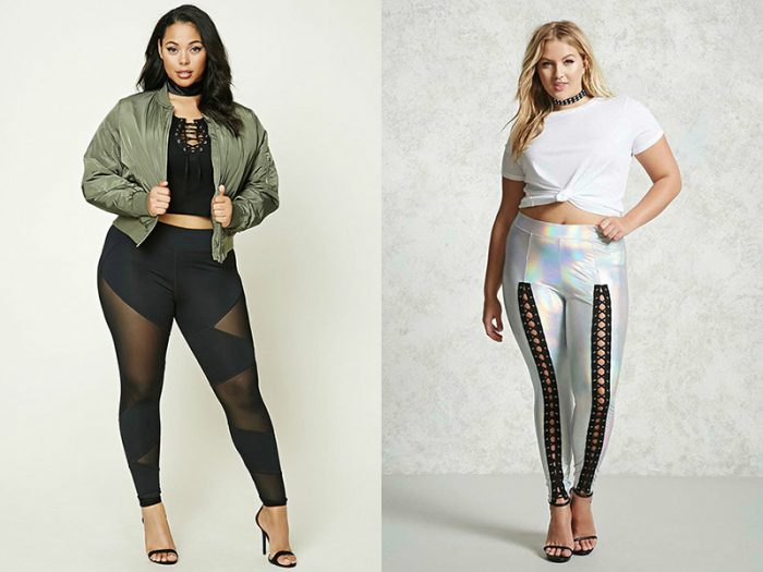 Тонкие леггинсы выделят каждую складку и бугорок, акцентируют внимание на бёдрах. Их можно носить только с туникой, которая спускается от середины бёдер и ниже. Также неплохой комплект получается из «кожаных» леггинсов и белой длинной рубашки.