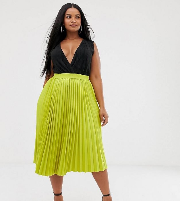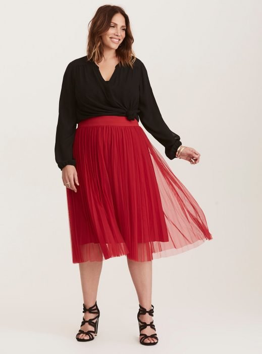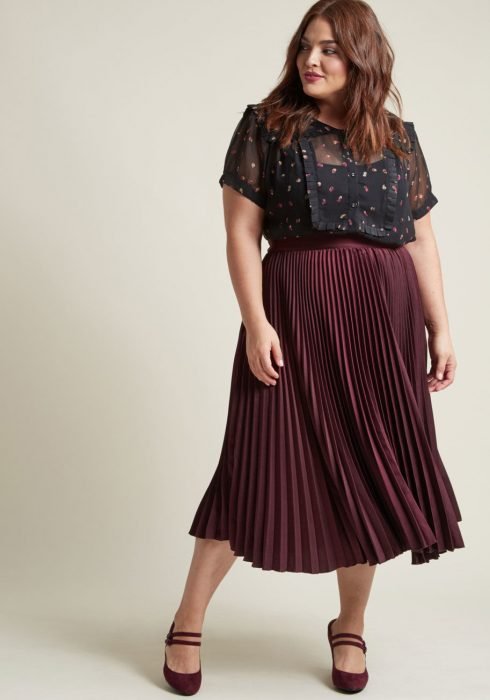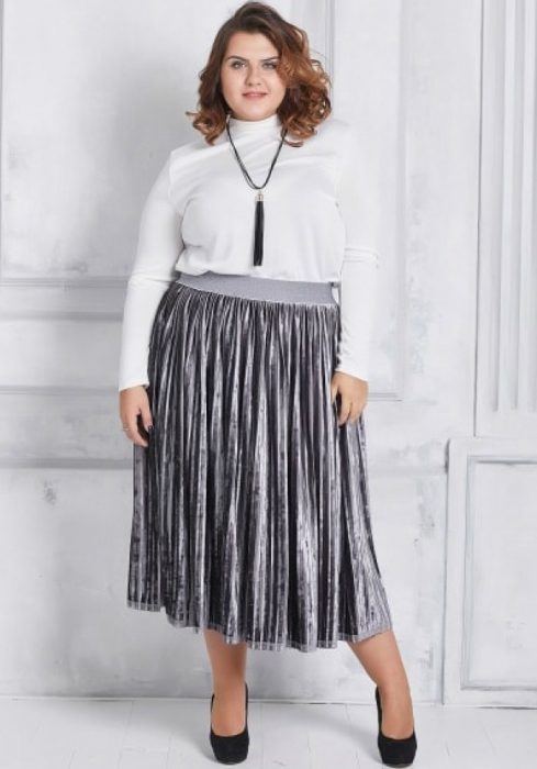 Полным девушкам с фигурой типа «яблоко» стоит обратить внимание на трапециевидную плиссированную юбку длины миди или в пол. Такая модель даст возможность уравновесить пропорции, «сгладить» округлости в районе живота и сделать фигуру более гармоничной.