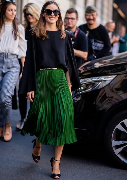 Обворожительно смотрятся плиссированные юбки средней длины.