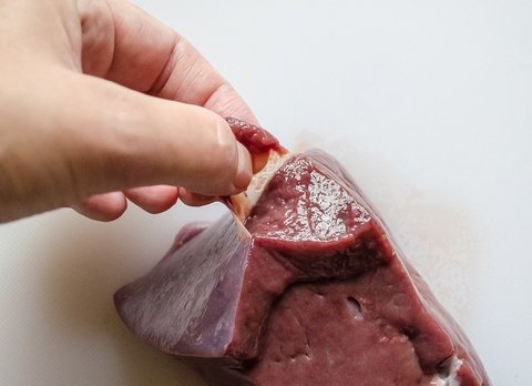 - Удалите лишнее. Сосуды, пленки, жилы — все это нужно удалить, иначе мягкости не добиться. Говяжью печень очистить от лишнего достаточно легко, но можно еще облегчить себе задачу, подержав продукт 3 минуты в теплой воде. Отделить пленку из свиной печенки сложнее. Однако если опустить субпродукт на 20 секунд в кипяток, пленка будет отделяться в два счета.