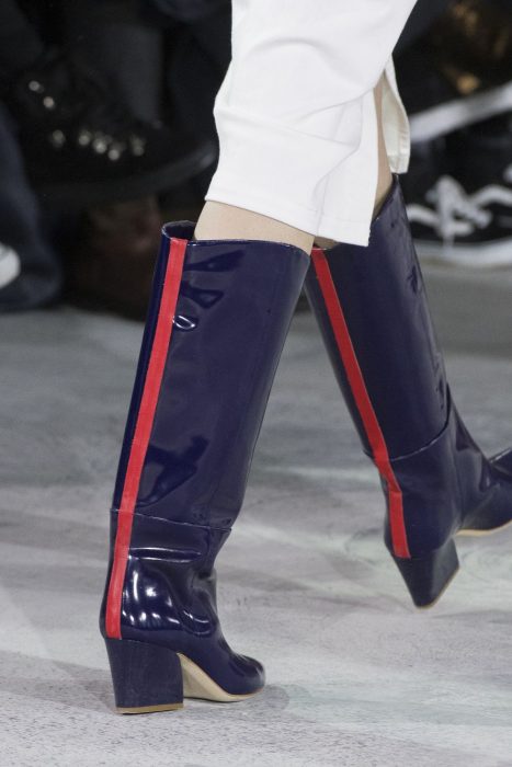 Заменить их зимой 2020 года можно обувью на небольших каблуках, сапожками белого цвета с эффектом глиттера либо кожаными ботфортами.