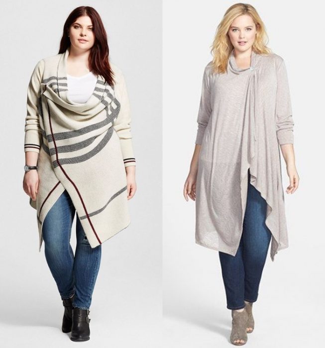 Оригинальным акцентом станет неровный край юбки, платья или кардигана. Он визуально вытянет фигуру. Кстати, усилить этот эффект помогут вертикальные полосы на изделии.