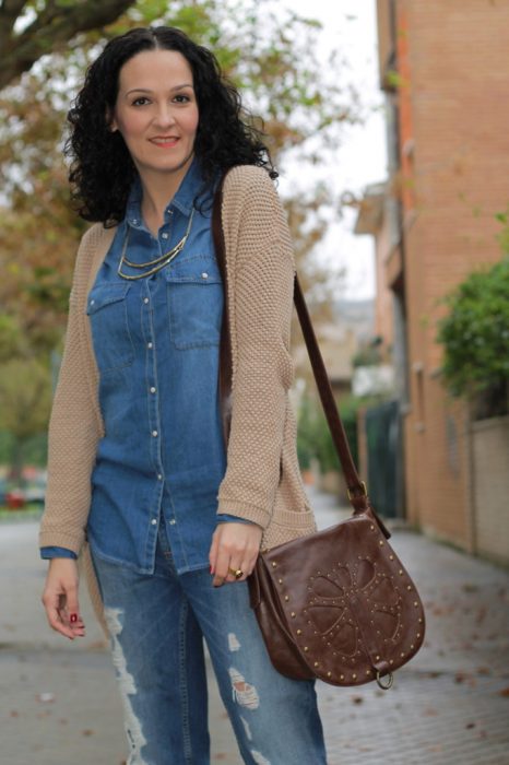 Сочетайте прямые джинсы с серым, отливающим серебром, жакетом, белой рубашкой и бежевыми туфлями. Такой образ выглядит стильно, свежо и подходит на каждый день.