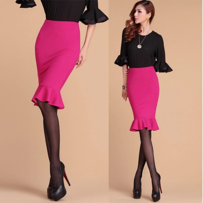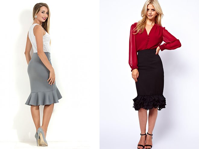 Элегантная приталенная юбка с большой оборкой по низу идеально впишется в офисный стиль. Эта модель сделает акцент на женственности, но при этом даст понять, что перед вами серьезный сотрудник. Отличным дополнением к юбке станет легкая блузка, выдержанная в строгом стиле. Такая юбка гармонично сочетается с туфлями, босоножками на шпильках или легкими балетками.