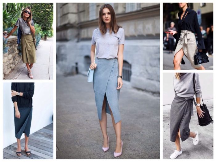 Очень женственно и романтично выглядят юбки с запахом. Такой фасон идеально подходит полным барышням и дамам с массивными бедрами. Элегантно смотрятся прямые модели. При этом запах значительно смягчает строгость кроя.