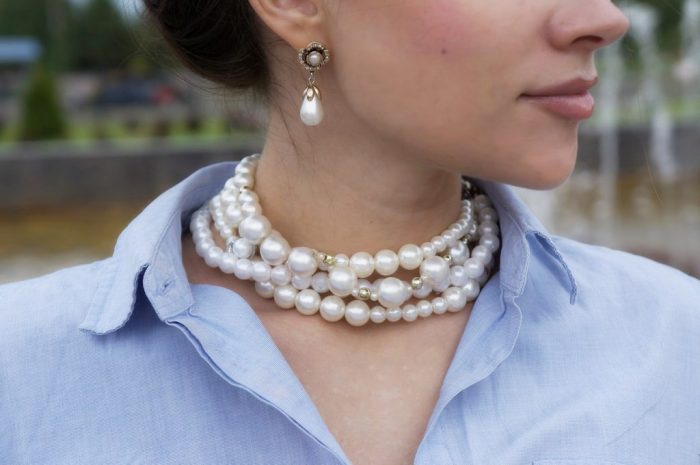 Удачно подобранное украшение оживит скучный образ. Например, асимметричные жемчужины разной формы, собранные в одно колье, смотрятся свежо и кокетливо. Привлекают внимание серьги, где камни идут по кругу, а также минималистичные варианты, где всего одна, но крупная жемчужина.